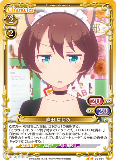 | 自分の「桜 ねね」が退場するごとに、キャラ1枚はターン終了時まで-20/-20を得る。[アプローチ/自分]:《2》自分の捨て札置き場にある、このターンの間に退場した「桜 ねね」1枚を手札に戻す。 | ||
