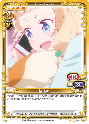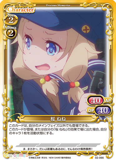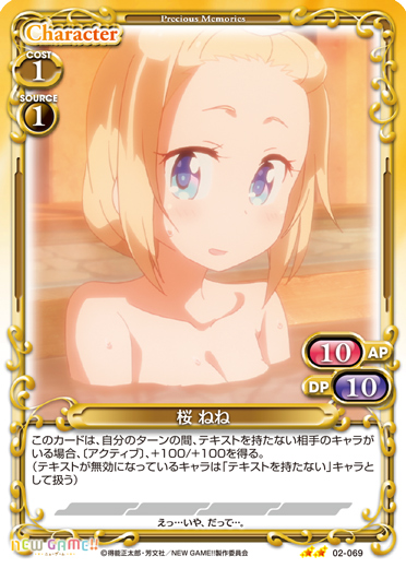 | このカードが登場した場合、ターン終了時に自分の捨て札置き場にある「桜 ねね」1枚を手札に戻すことができる。 | ||