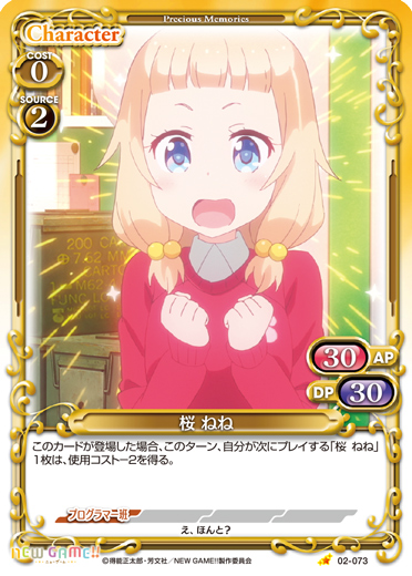 | このカードが登場した場合、このターン、自分が次にプレイする「桜 ねね」1枚は、使用コスト-2を得る。 | ||