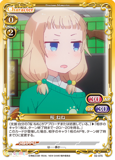 | 〔支援:自分の「桜 ねね」がアプローチまたは妨害している。〕▶「相手のキャラ1枚は、ターン終了時まで-20/-20を得る。」このカードが登場した場合、相手のキャラ1枚のAPを、ターン終了時まで0に変更する。 | ||