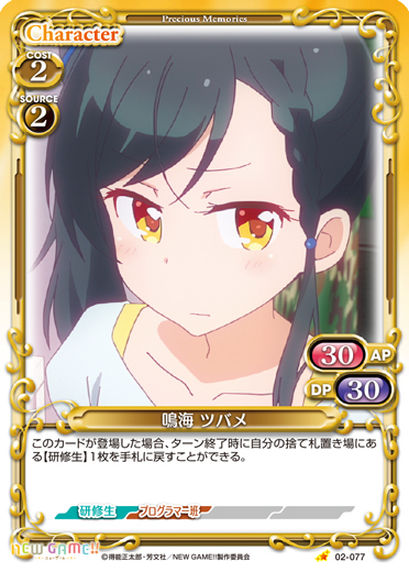 | このカードが登場した場合、ターン終了時に自分の捨て札置き場にある【研修生】1枚を手札に戻すことができる。 | ||