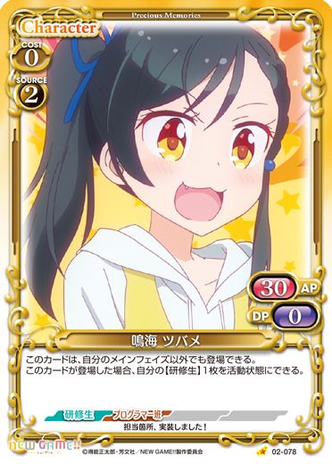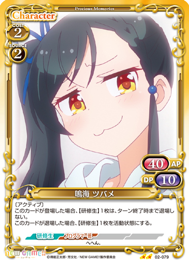 | 〔アクティブ〕このカードが登場した場合、【研修生】1枚は、ターン終了時まで退場しない。このカードが退場した場合、【研修生】1枚を活動状態にする。 | ||