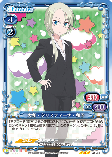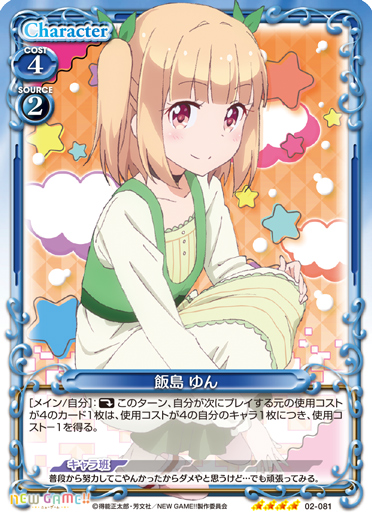 | [メイン/自分]:《休》このターン、自分が次にプレイする元の使用コストが4のカード1枚は、使用コストが4の自分のキャラ1枚につき、使用コスト-1を得る。 | ||