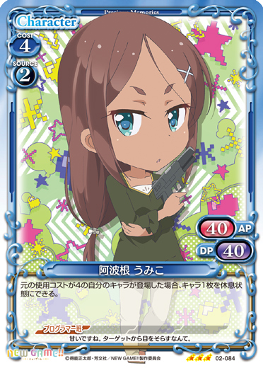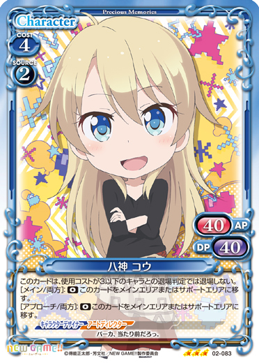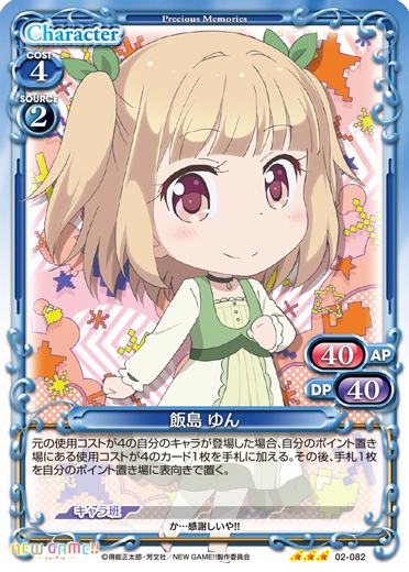 | 元の使用コストが4の自分のキャラが登場した場合、自分のポイント置き場にある使用コストが4のカード1枚を手札に加える。その後、手札1枚を自分のポイント置き場に表向きで置く。 | ||