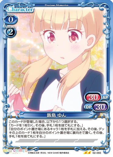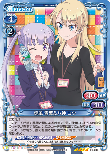 | 〔コンビ〕このカードが捨て札置き場にある状態で、元の使用コストが4の自分のキャラが登場するごとに、このカードを場に出すことができる。このカードが場から捨て札置き場に置かれる場合、代わりにゲームから取り除く。 | ||