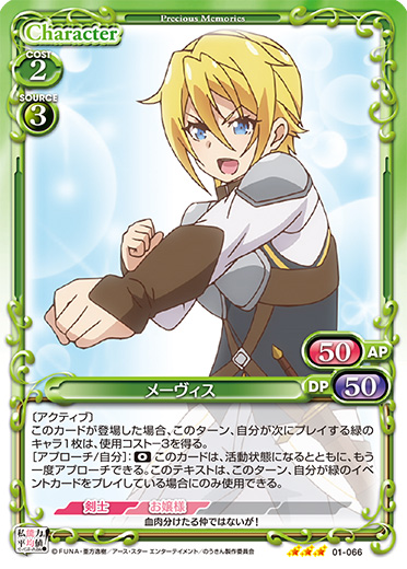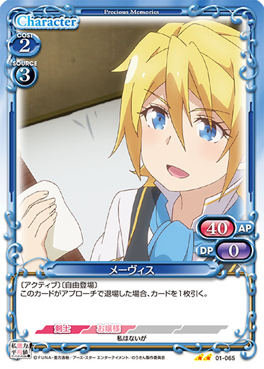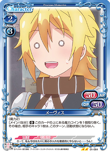| 〔魔力2〕[メイン/自分]:《0》このカードの上にある魔力コインを1個取り除く。その場合、相手のキャラ1枚は、このターン、活動状態にならない。 | ||