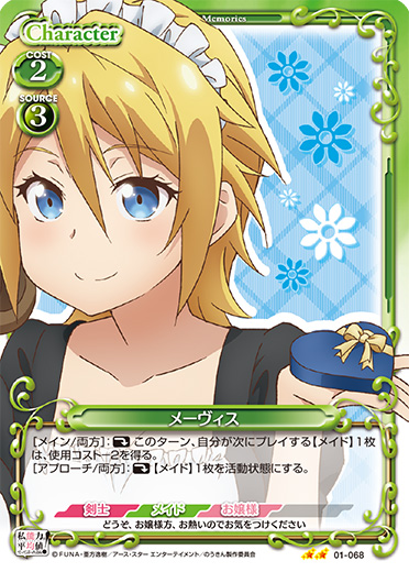 | [メイン/両方]:《休》このターン、自分が次にプレイする【メイド】1枚は、使用コスト-2を得る。[アプローチ/両方]:《休》【メイド】1枚を活動状態にする。 | ||