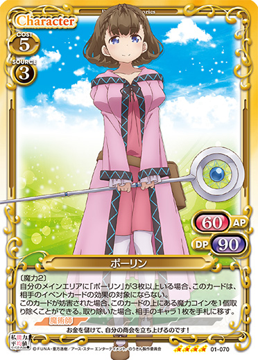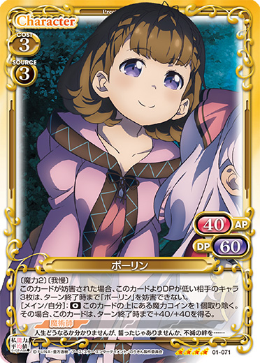 | 〔魔力2〕自分のメインエリアに「ポーリン」が3枚以上いる場合、このカードは、相手のイベントカードの効果の対象にならない。このカードが妨害された場合、このカードの上にある魔力コインを1個取り除くことができる。取り除いた場合、相手のキャラ1枚を手札に移す。 | ||