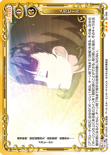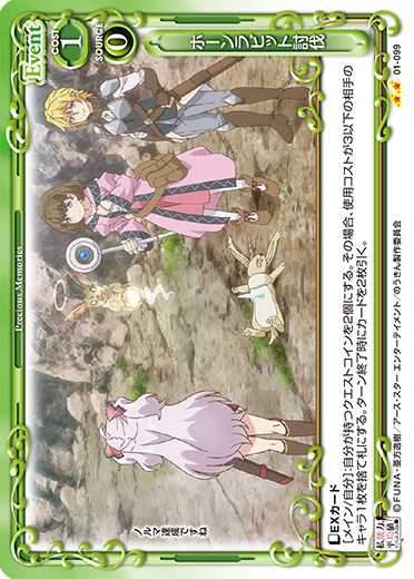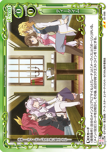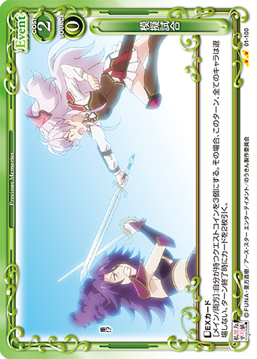 | 〔EXカード〕[メイン/自分]:自分が持つクエストコインを2個にする。その場合、使用コストが3以下の相手のキャラ1枚を捨て札にする。ターン終了時にカードを2枚引く。 | ||