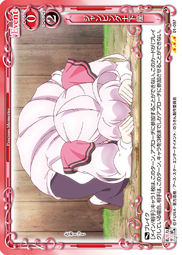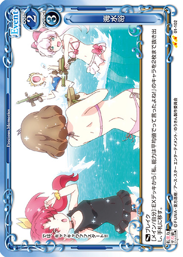 | 〔ブレイク〕[メイン/自分]:EXデッキから『私、能力は平均値でって言ったよね!』のキャラを2枚まで抜き出し、手札に移す。 | ||