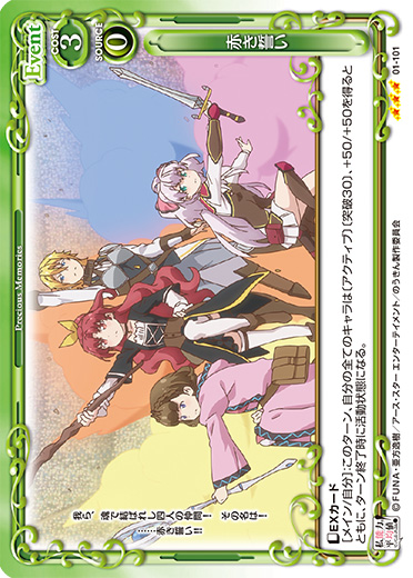 | 〔EXカード〕[メイン/自分]:このターン、自分の全てのキャラは〔アクティブ〕〔突破30〕、+50/+50を得るとともに、ターン終了時に活動状態になる。 | ||