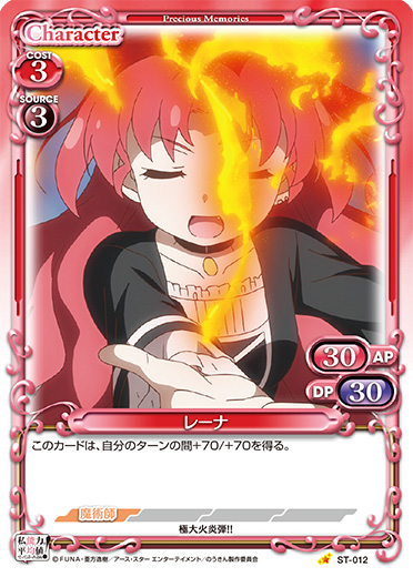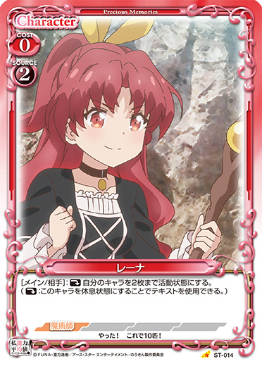 | [メイン/相手]:《休》自分のキャラを2枚まで活動状態にする。(《休》:このキャラを休息状態にすることでテキストを使用できる。) | ||