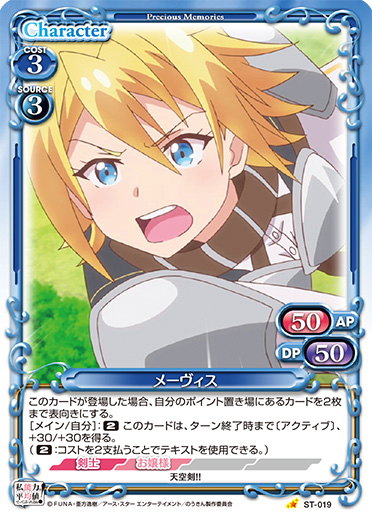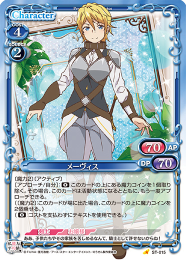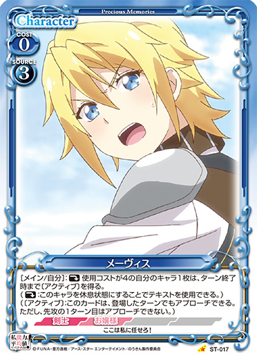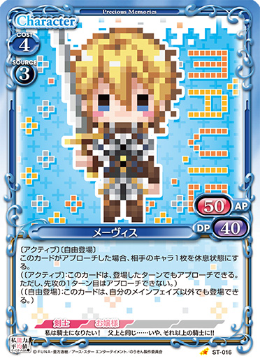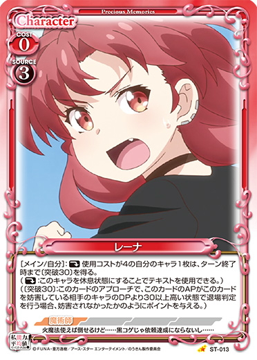 | 〔アクティブ〕〔自由登場〕このカードがアプローチした場合、相手のキャラ1枚を休息状態にする。(〔アクティブ〕:このカードは、登場したターンでもアプローチできる。ただし、先攻の1ターン目はアプローチできない。)(〔自由登場〕:このカードは、自分のメインフェイズ以外でも登場できる。) | ||