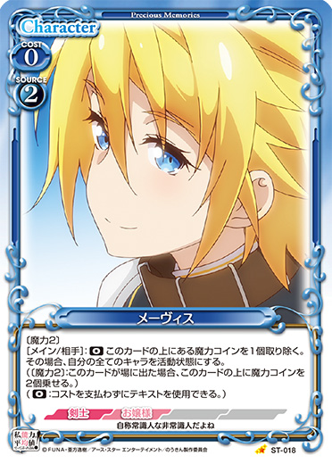 | 〔魔力2〕[メイン/相手]:《0》このカードの上にある魔力コインを1個取り除く。その場合、自分の全てのキャラを活動状態にする。(〔魔力2〕:このカードが場に出た場合、このカードの上に魔力コインを2個乗せる。)(《0》:コストを支払わずにテキストを使用できる。) | ||