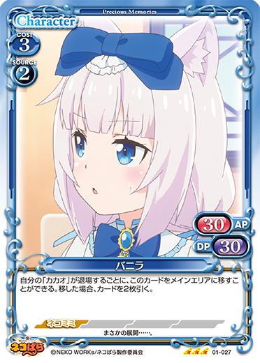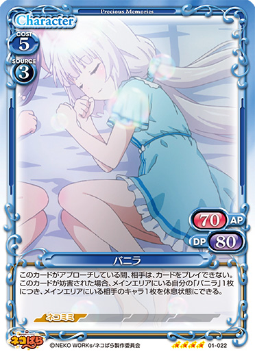 | このカードがアプローチしている間、相手は、カードをプレイできない。このカードが妨害された場合、メインエリアにいる自分の「バニラ」1枚につき、メインエリアにいる相手のキャラ1枚を休息状態にできる。 | ||
