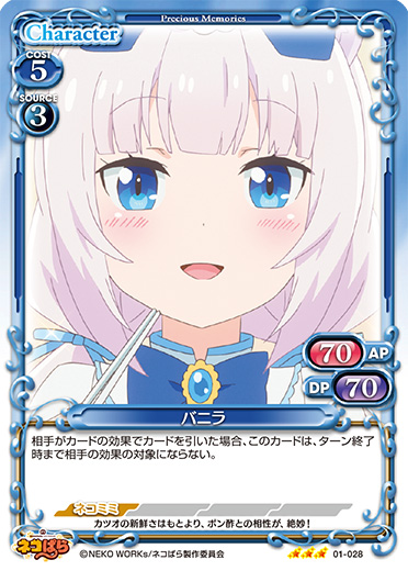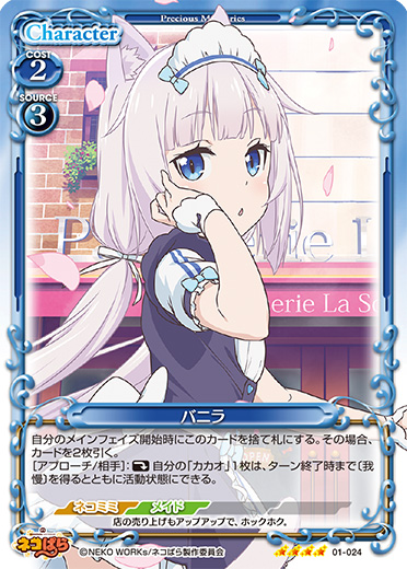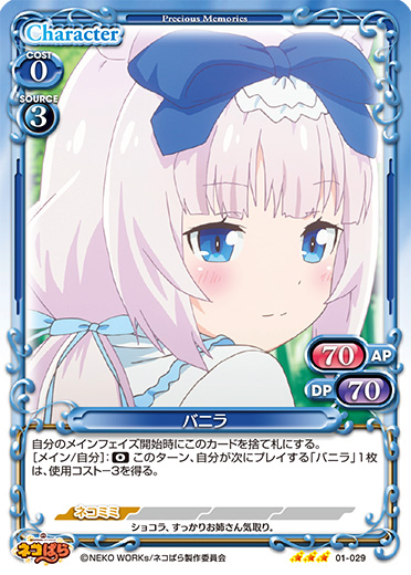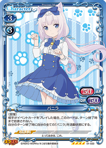 | 〔我慢〕相手がイベントカードをプレイした場合、このカードは、ターン終了時まで妨害されない。自分のターン終了時に自分の全ての「バニラ」を活動状態にする。 | ||
