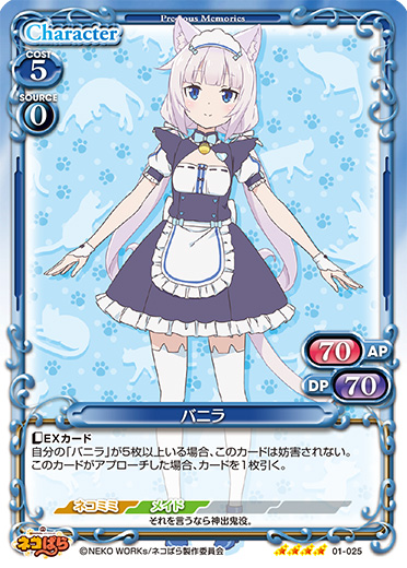 | 〔EXカード〕自分の「バニラ」が5枚以上いる場合、このカードは妨害されない。このカードがアプローチした場合、カードを1枚引く。 | ||