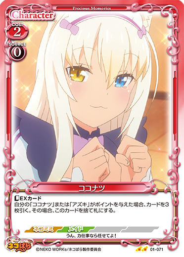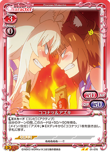 | 〔EXカード〕〔コンビ〕〔アクティブ〕自分のターンの間、このカードは+50/+50を得る。[メイン/自分]:「アズキ」▶EXデッキから「ココナツ」1枚を抜き出し、手札に移す。 | ||