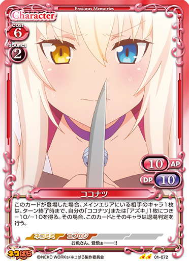 | このカードが登場した場合、メインエリアにいる相手のキャラ1枚は、ターン終了時まで、自分の「ココナツ」または「アズキ」1枚につき-10/-10を得る。その場合、このカードとそのキャラは退場判定を行う。 | ||