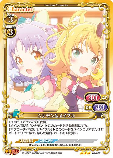 | 〔コンビ〕〔アクティブ〕〔我慢〕 [メイン/両方]:「シナモン」▶このカードを活動状態にする。 [アプローチ/両方]:「メイプル」▶このカードをメインエリアまたはサポートエリアに移す。移した場合、カードを1枚引く。 | ||