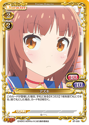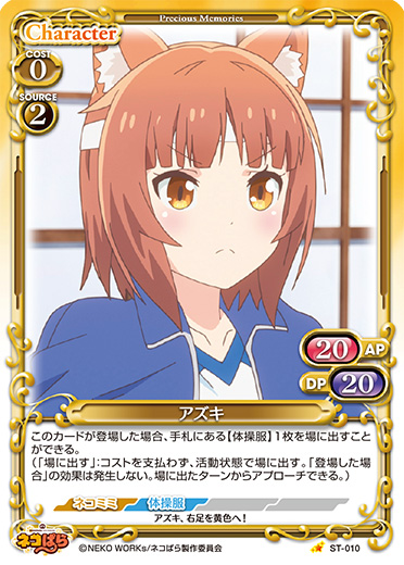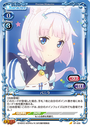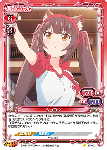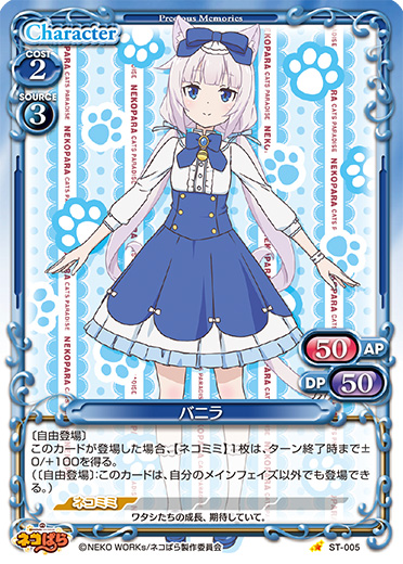 | 〔自由登場〕このカードが登場した場合、【ネコミミ】1枚は、ターン終了時まで±0/+100を得る。(〔自由登場〕:このカードは、自分のメインフェイズ以外でも登場できる。) | ||
