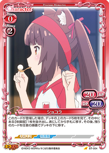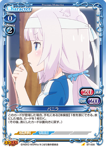 | このカードが登場した場合、手札にある【ネコミミ】1枚を捨て札にできる。捨て札にした場合、カードを2枚引く。 | ||
