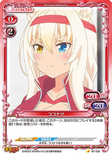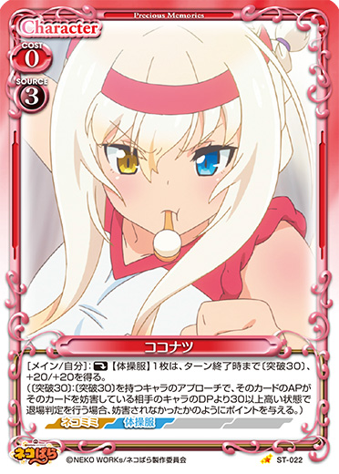 | このカードが登場した場合、このターン、自分が次にプレイする【体操服】1枚は、使用コスト-6を得る。 | ||