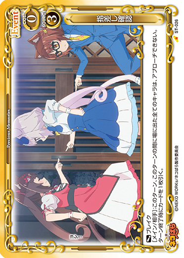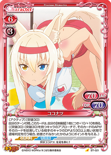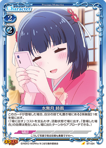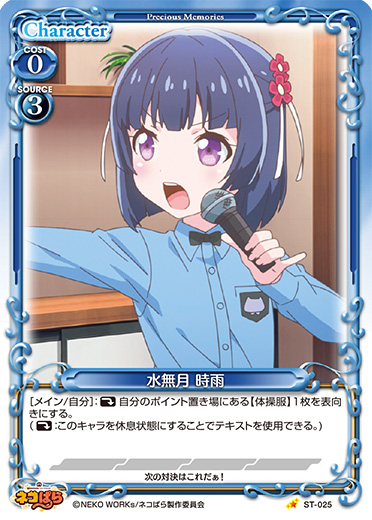 | [メイン/自分]:《休》自分のポイント置き場にある【体操服】1枚を表向きにする。(《休》:このキャラを休息状態にすることでテキストを使用できる。) | ||