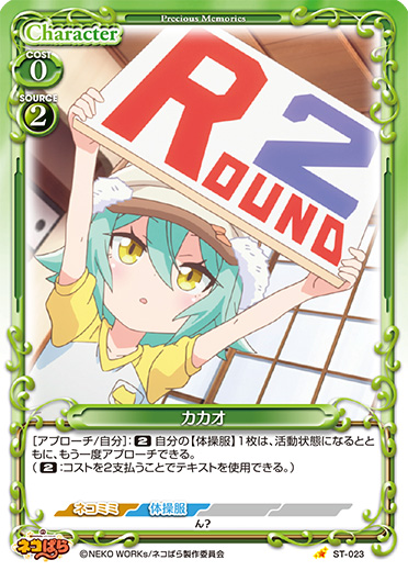 | [アプローチ/自分]:《2》自分の【体操服】1枚は、活動状態になるとともに、もう一度アプローチできる。(《2》:コストを2支払うことでテキストを使用できる。) | ||