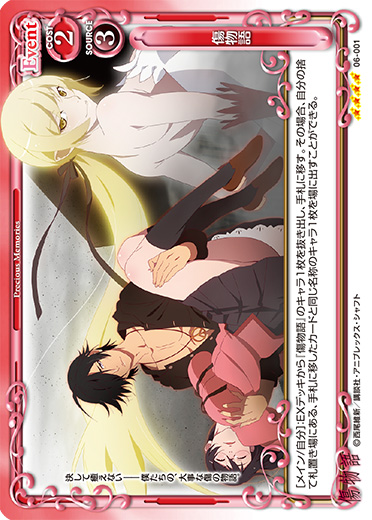 | [メイン/自分]:EXデッキから『傷物語』のキャラ1枚を抜き出し、手札に移す。その場合、自分の捨て札置き場にある、手札に移したカードと同じ名称のキャラ1枚を場に出すことができる。 | ||