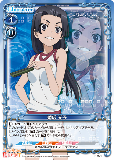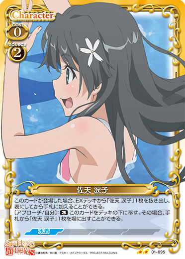 | このカードが登場した場合、EXデッキから「佐天 涙子」1枚を抜き出し、表にしてから手札に加えることができる。[アプローチ/自分]:《3》このカードをデッキの下に移す。その場合、手札から「佐天 涙子」1枚を場に出すことができる。 | ||