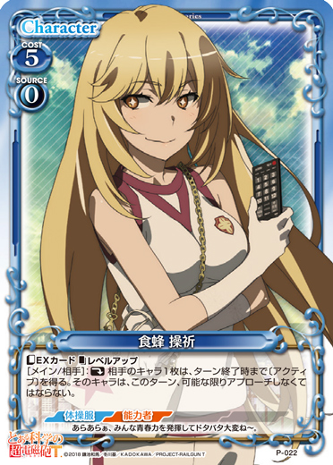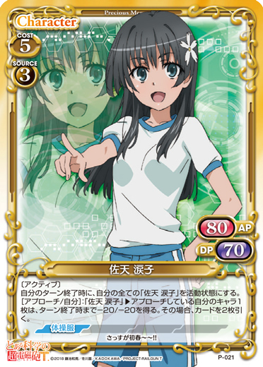 | 〔アクティブ〕自分のターン終了時に、自分の全ての「佐天 涙子」を活動状態にする。[アプローチ/自分]:「佐天 涙子」▶アプローチしている自分のキャラ1枚は、ターン終了時まで-20/-20を得る。その場合、カードを2枚引く。 | ||
