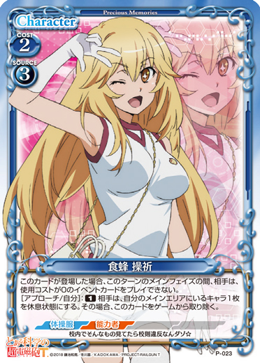 | このカードが登場した場合、カードを2枚引く。[アプローチ/両方]:《4》自分の捨て札置き場にある『傷物語』のキャラ1枚をメインエリアに出す。その場合、このカードをゲームから取り除く。 | ||