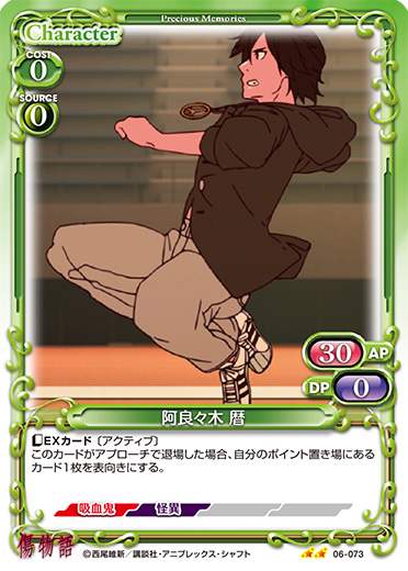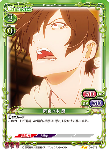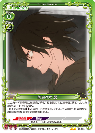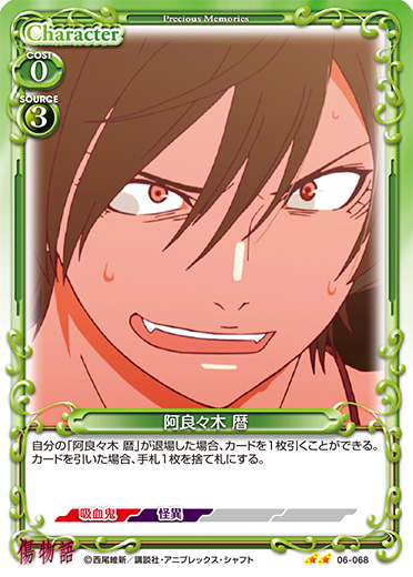 | 自分の「阿良々木 暦」が退場した場合、カードを1枚引くことができる。カードを引いた場合、手札1枚を捨て札にする。 | ||