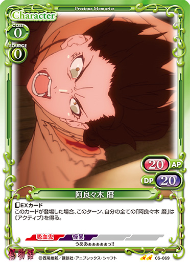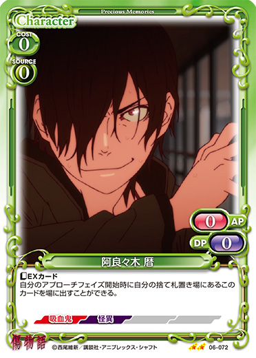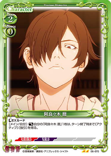 | 〔EXカード〕[メイン/自分]:《休》自分の「阿良々木 暦」1枚は、ターン終了時まで〔アクティブ〕〔強引〕を得る。 | ||