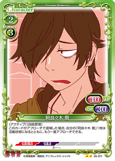 | 〔アクティブ〕〔自由登場〕このカードがアプローチで退場した場合、自分の「阿良々木 暦」1枚は活動状態になるとともに、もう一度アプローチできる。 | ||