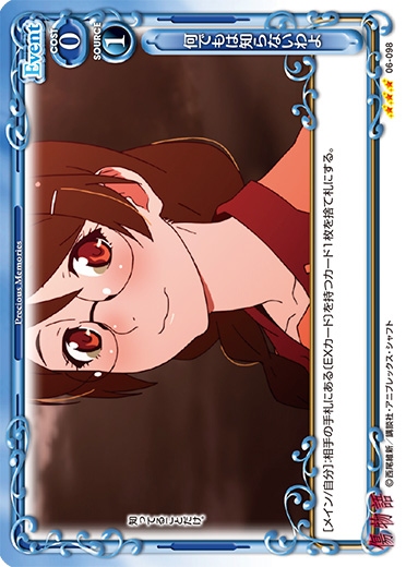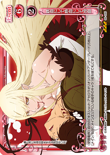 《使用条件》:【吸血鬼】を持つ自分の「阿良々木 暦」3枚以上。[アプローチ/両方]:自分の捨て札置き場にある、このターンの間に退場した『傷物語』のキャラ1枚を場に出す。このターン、そのキャラが退場した場合、自分の捨て札置き場にあるそのキャラを場に出す。