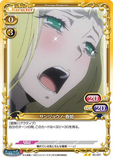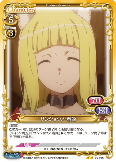 | 〔冒険〕このカードは、自分のターン終了時に活動状態になる。[メイン/両方]:「サンジョウノ・春姫」▶このカードは、ターン終了時まで〔我慢〕を得る。 | ||