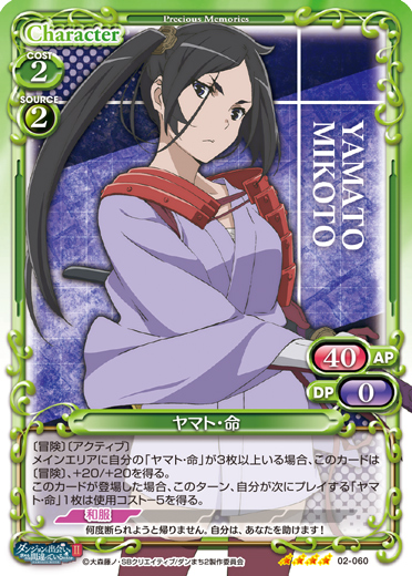 | 〔冒険〕〔アクティブ〕メインエリアに自分の「ヤマト・命」が3枚以上いる場合、このカードは〔冒険〕、+20/+20を得る。このカードが登場した場合、このターン、自分が次にプレイする「ヤマト・命」1枚は使用コスト-5を得る。 | ||