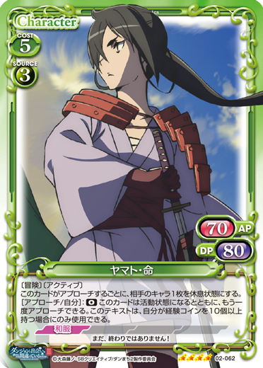 | 〔冒険〕〔我慢〕自分の「ヤマト・命」がアプローチしている間、相手のキャラは休息状態で場に出る。自分の「ヤマト・命」がポイントを与えた場合、カードを1枚引く。 | ||
