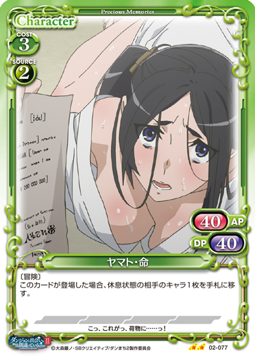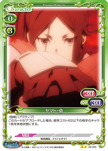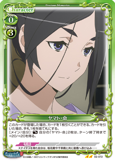 | 〔冒険〕このカードが登場した場合、このターン、自分の全ての「ヤマト・命」は+10/+10を得るとともに、ターン終了時に活動状態になる。 | ||