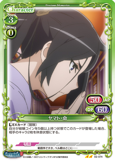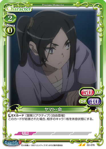 | 〔EXカード〕このカードは、自分の「ヤマト・命」がいる場合、アプローチフェイズでも登場できる。このカードが登場した場合、自分の「ヤマト・命」1枚を活動状態にする。 | ||