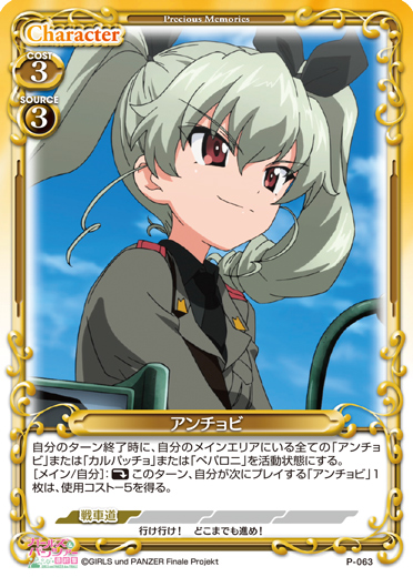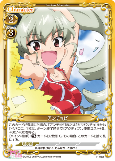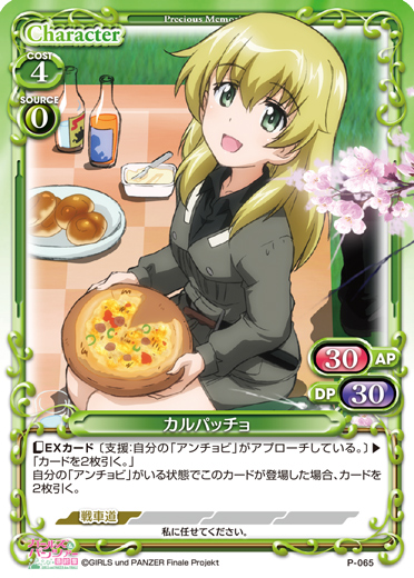 | 〔EXカード〕〔支援:自分の「アンチョビ」がアプローチしている。〕▸「カードを2枚引く。」自分の「アンチョビ」がいる状態でこのカードが登場した場合、カードを2枚引く。 | ||