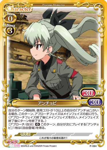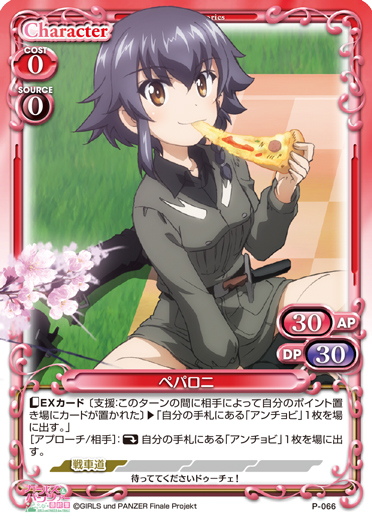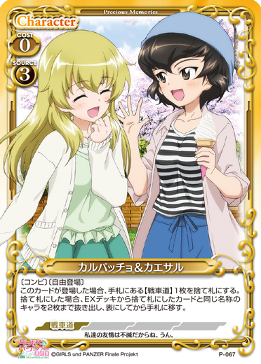| 〔コンビ〕〔自由登場〕このカードが登場した場合、手札にある【戦車道】1枚を捨て札にする。捨て札にした場合、EXデッキから捨て札にしたカードと同じ名称のキャラを2枚まで抜き出し、表にしてから手札に移す。 | ||