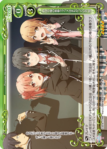 | このカードが登場した場合、カードを2枚引く。[アプローチ/両方]:《0》このカードをゲームから取り除く。その場合、手札から「比企谷 八幡」1枚を場に出すことができる。 | ||