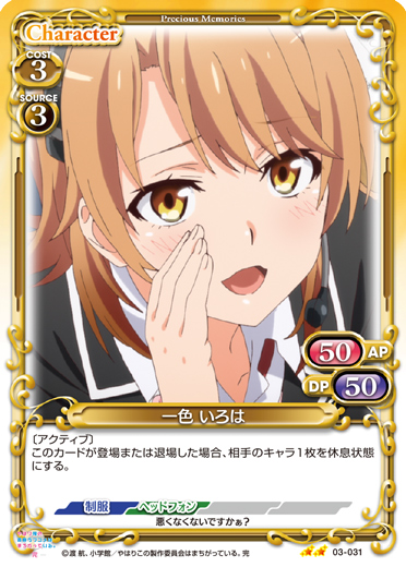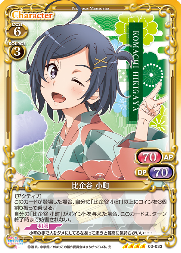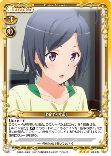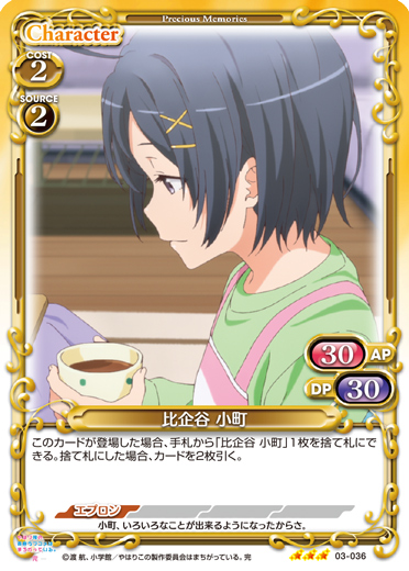 | 〔アクティブ〕このカードが登場した場合、自分の「比企谷 小町」の上にコインを3個割り振って乗せる。自分の「比企谷 小町」がポイントを与えた場合、このカードは、ターン終了時まで妨害されない。 | ||