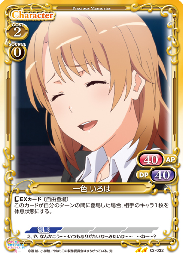 | 〔EXカード〕このカードが、自分の「比企谷 小町」がいる状態で登場した場合、カードを2枚引く。このカードが退場した場合、EXデッキから「比企谷 小町」1枚を抜き出し、手札に移す。 | ||