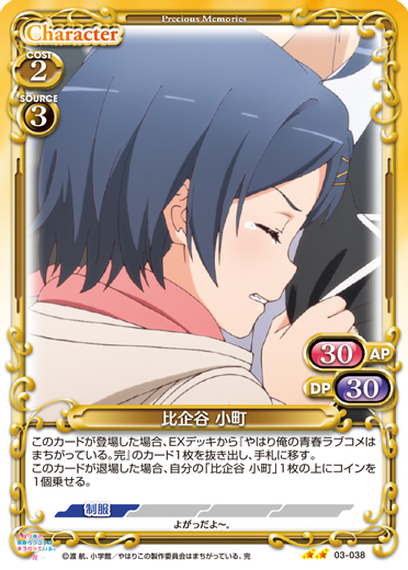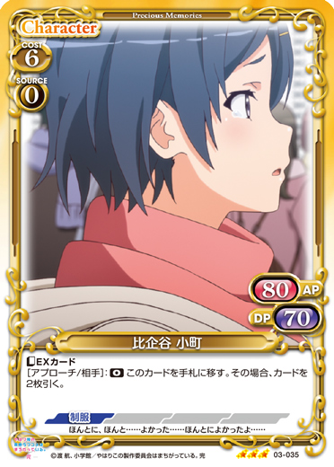 | このカードが登場した場合、EXデッキから『やはり俺の青春ラブコメはまちがっている。完』のカード1枚を抜き出し、手札に移す。このカードが退場した場合、自分の「比企谷 小町」1枚の上にコインを1個乗せる。 | ||