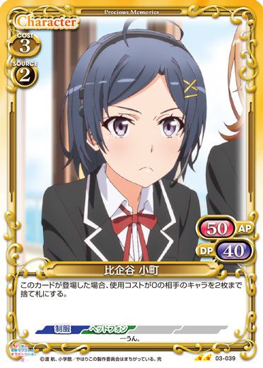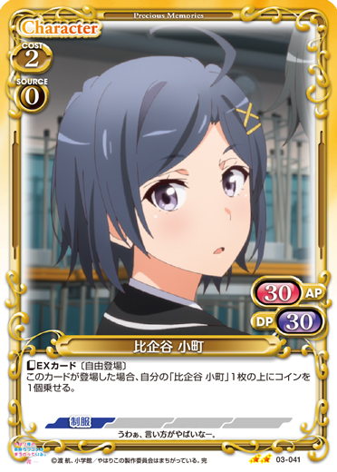 | 〔EXカード〕〔自由登場〕このカードが登場した場合、自分の「比企谷 小町」1枚の上にコインを1個乗せる。 | ||