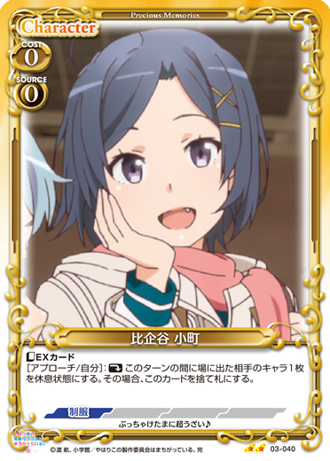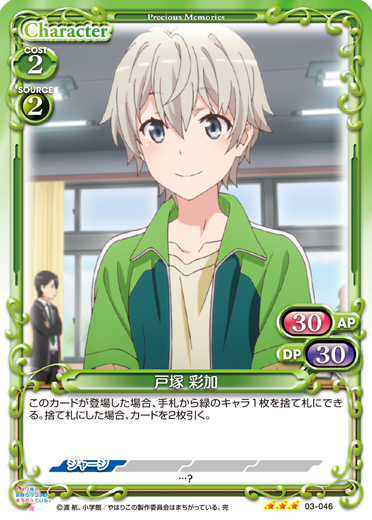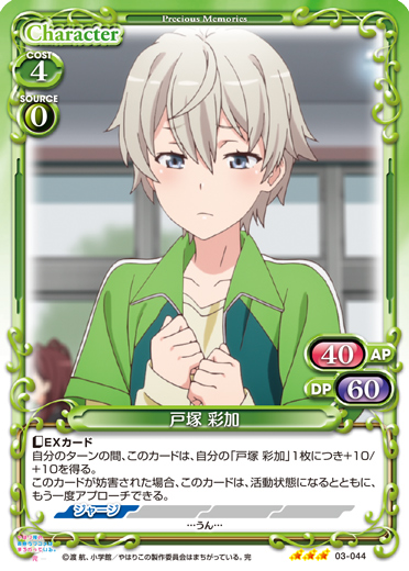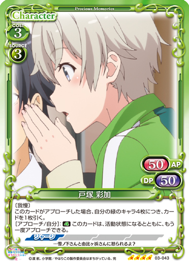 | 〔EXカード〕このカードが登場した場合、カードを2枚引く。[アプローチ/自分]:《3》自分の「戸塚 彩加」1枚は、活動状態になるとともに、もう一度アプローチできる。 | ||
